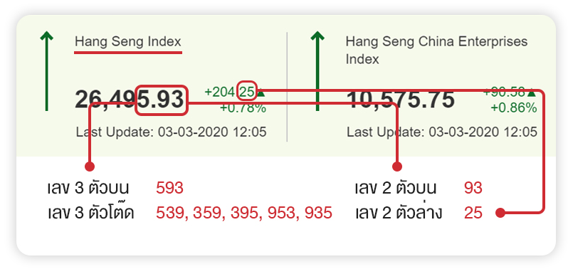วิธีการตรวจหวยหุ้นฮั่งเส็ง เลขสามตัวและสองตัวบน จะใช้เลขหลักหน่วยและเลขหลังจุดทศนิยมของผลดัชนีปิดตลาดหุ้น เลขสองตัวล่าง จะใช้เลขหลังจุดทศนิยมของค่า Change ในช่วงการปิดตลาดมาเป็น 2 ตัวล่าง